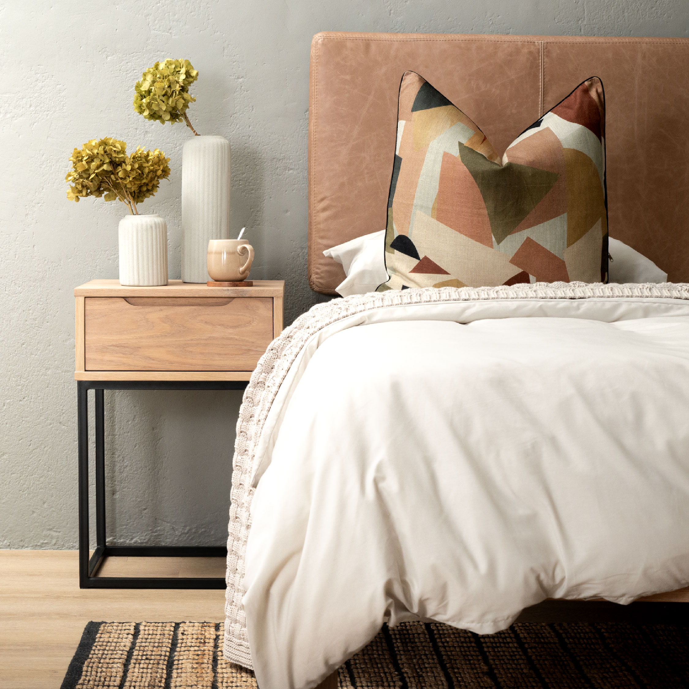 Think throws, rugs, cushions, and soft upholstery. Natural fibres (cotton, linen, wool) are breathable and gentle. Create cosiness by layering textures like a chunky knit throw over a leather couch or a soft rug underfoot.