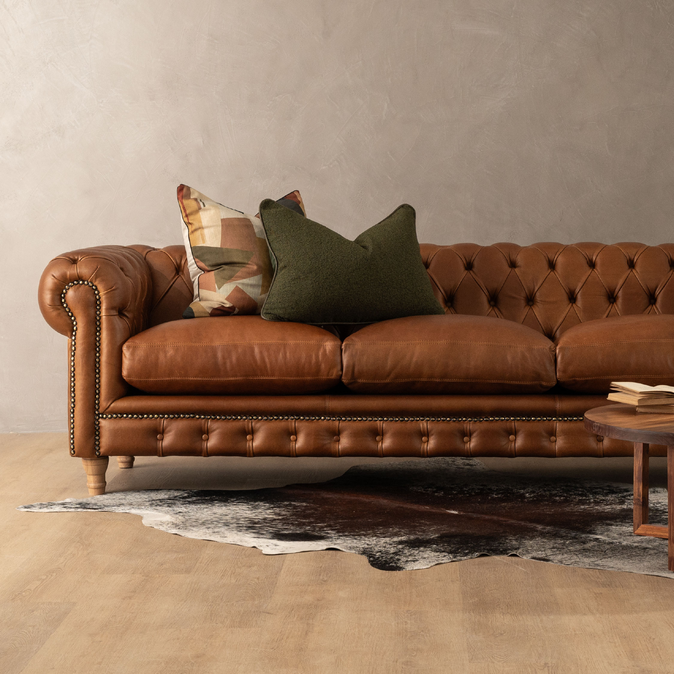 A classic leather couch with deep tufting that offers both luxury and structure. Its leather finish offers unmistakable richness. Soften its formality with linen scatter cushions or muted cotton throws. - Clanwilliam 3‑Seater Leather Couch – Ginger